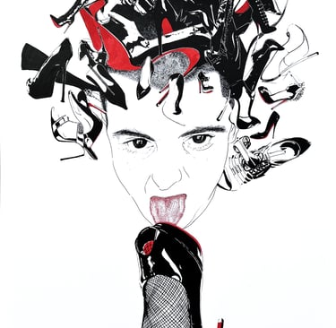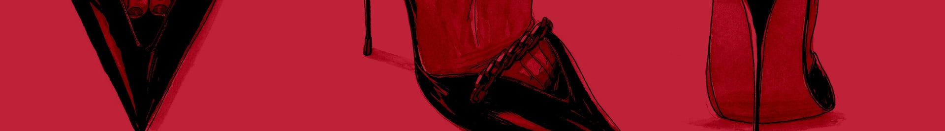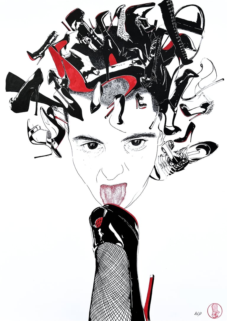High-heeled shoes are THE central theme of the drawings, with which the woman, the dominatrix, tramples, crushes, strikes... High heels are THE central subject that the slave, the submissive, licks, kisses, worships, and under which he suffers. High heels are not just a simple accessory, they are THE main character in a scene of domination involving three, four or even more people...